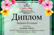 Поздравляем Алиеву Айсел с дипломом 2 степени (педагог Куприянова Г.Р.) арт-студия "Ажур" с победой во Всероссийском творческом конкурсе "Дорогие наши мамы", посвященный Дню матери. Желаем дальнейших творческих побед!