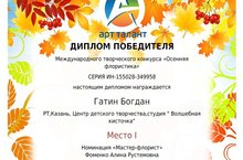 Поздравляем обучающихся студии «Волшебная кисточка» (педагог Фоменко А.Р.), Гатина Богдана, занявшего I место; Елисеева Арсения, занявшего II место в Международном творческом конкурсе «Осенняя флористика».