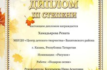 Поздравляем Хамадьярову Ренату, обучающуюся объединения "Изобразительное творчество" (педагог Богатырева Н.А.) с дипломом III степени в Международном творческом конкурсе "Осенняя фантазия". Желаем творческих успехов в будущем!