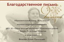 Поздравляем педагога Фоменко А .Р. с получением благодарственного письма за отличную подготовку педагогическое сопровождение участников Всероссийского творческого конкурса, посвященного дню Победы в Великой Отечественной войне "Эхо Победы".