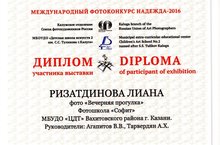 Поздравляем Ризатдинову Лиану, обучающуюся фотошколы "Софит" (педагоги Тарвердян Алсу Ханифовна, Агапитов Виталий Владимирович), получившую Диплом в Международном фотоконкурсе "Надежда".