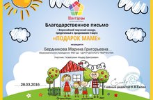 Поздравляем педагога дополнительного образования Бердникову М.Г. с получением благодарственного письма за подготовку победителей Всероссийского творческого конкурса, приуроченного к празднованию 8 марта «Подарок маме».