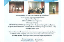 Поздравляем заведующую отделом реабилитации Шашину Татьяну Борисовну и весь коллектив Центра детского творчества, получивших благодарность администрации ГБОУ "Казанская школа № 76 для детей с ограниченными возможностями здоровья" за организацию и проведение городского фестиваля детского творчества детей с ОВЗ "Весенняя капель".