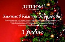 Поздравляем Хакимова Камиля, обучающегося объединения «Изобразительное творчество» (педагог Бердникова М.Г.), занявшего 3 место в Всероссийском творческом конкурсе «Зимняя сказка 2», номинация «Поздравительная открытка».
