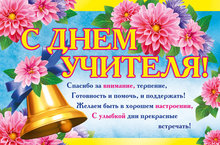 Дорогие наши педагоги! Поздравляем Вас со Всемирным днем учителя! Высоко ценим щедрость Ваших любящих сердец, Ваше терпение и понимание, преданность делу и любовь к своим ученикам! Желаем крепчайшего здоровья, бодрости тела и духа, радости от вашего нелегкого труда и удач в личной жизни! Пусть вас окружают уважение и любовь, доброжелательность и милосердие, жизнерадостность и благодарность учеников!