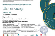 Подведены итоги международного конкурса фестиваля "Шаг на сцену". Карасева Вера, учащаяся театра "Арт" (педагог Лия Ринатовна Хасанова), стала лауреатом II степени. Сама Лия Ринатовна была отмечена благодарственным письмом конкурса. Поздравляем!!!