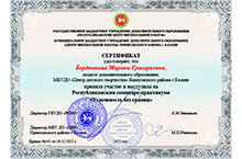 Педагоги Центра детского творчества ни на один день не прекращают совершенствовать свое педагогическое мастерство. Повышают уровень профессиональных компетенций не только на курсах повышения квалификации, но и участвуя в научно-практических конференциях и семинарах различного уровня, а также публикуя статьи в научных сборниках. Так, педагог объединения "В мире знаний и творчества" Марина Григорьевна Бердникова выступила на республиканском семинаре-практикуме "Успешность без границ", который прошел в Центре внешкольной работы Приволжского района в декабре 2022 года.