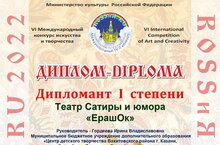 Учащиеся театра эстрады, сатиры и юмора "ЕрашОК" стали лауреатами I, II и III степеней, а также дипломантами I и II степеней VI международного конкурса искусства и творчества "ROSSиЯ.RU". Поздравляем коллектив театра и руководителя объединения Гордееву Ирину Владиславовну!