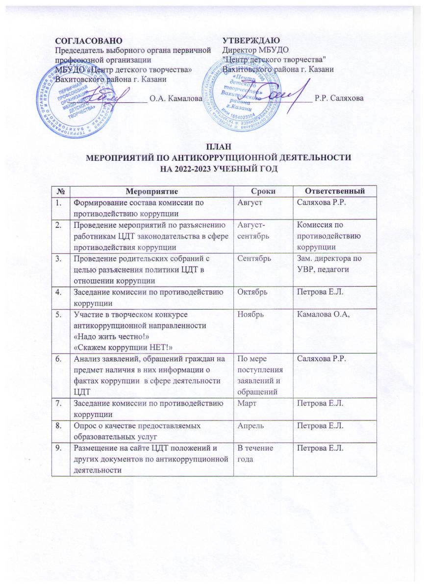 План мероприятий по антикоррупционной деятельности в ЦДТ 2022-2023