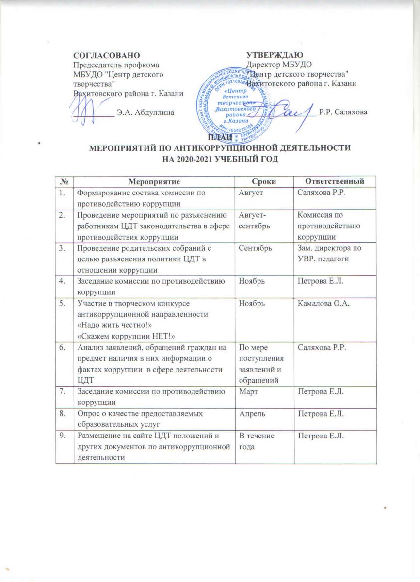 План мероприятий по антикоррупционной деятельности в ЦДТ 2020-2021