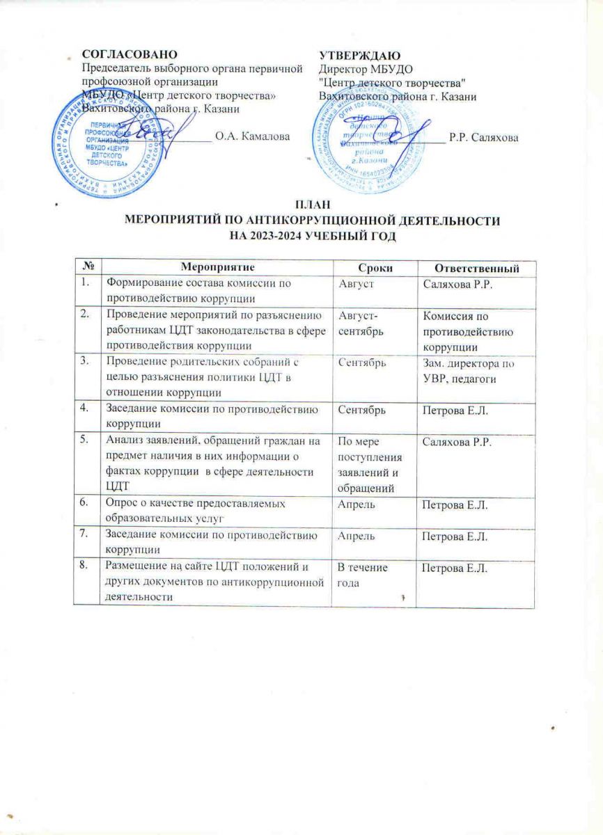 План мероприятий по антикоррупционной деятельности в ЦДТ 2023-2024