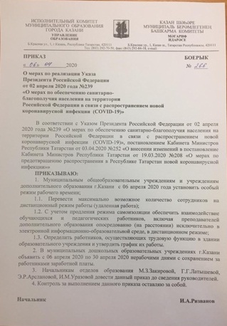 Приказ УО г. Казани от 24.03.2020 № 246 "Об организации образовательной деятельности в учреждениях дополнительного образования г. Казани в условиях распространения новой коронавирусной инфекции"