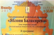 25 сентября в 14.30 первоклассников ДШИ им.М.А. Балакирева, а также их родителей приглашаем на традиционный школьный праздник - презентацию школы "Яблоня Балакирева". Маленьких гостей ждут путешествие в мир "Казанской Балакиревки", веселая викторина и маленькие сюрпризы