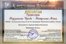 Зажигательно и даже мастерски выступили наши юные пианисты - дуэт Мирзиянова Ирада и Матросова Алёна - класса преподавателя Ермаковой Марины Викторовны на Всероссийском творческом конкурсе "К вершинам искусства" (г. Екатеринбург). Девочки заслуженно были награждены дипломами наивысшей степени - Гран-при. Компетентные члены жюри отметили отличный выбор произведения, прекрасную работу преподавателя и исполнителей, восхитительный ансамбль.