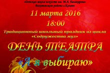 11 марта 2016 года в концертном зале ДЦ «Экият» прошёл традиционный школьный праздник День Театра «А я выбираю» из цикла «Содружество муз». Программа мероприятий была насыщенной и интересной: