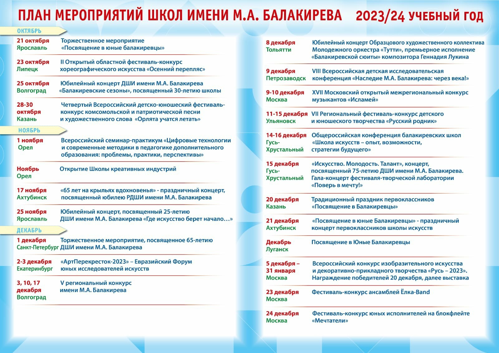 Уважаемые коллеги! Дорогие друзья! Приглашаем вас присоединиться к активной творческой жизни Балакиревских школ России и принимать участие в наших конкурсах, фестивалях, конференциях! В афише можно ознакомиться с перечнем мероприятий, а подробную информацию вы узнаете на сайтах школ искусств им. М. А. Балакирева разных городов. Добро пожаловать в наше активное движение!