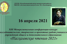 Приглашаем Вас принять участие в XIII Межрегиональной конференции-конкурсе исследовательских и творческих работ учащихся «Пасхаловские чтения - 2021», которая пройдет на базе МБУДО «Детская школа искусств им. М.А. Балакирева» Вахитовского района г. Казани в период с 1 марта 2021 г. по 16 апреля 2021 г.