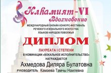 В Международном онлайн конкурсе-фестивале речевого и вокального искусства языков народов Поволжья «Илhамият – VI. Вдохновение» учащаяся вокально-хорового отделения Ахмедова Диляра (преп. Камаева Т.Н.) стала Лауреатом I степени! Поздравляем!