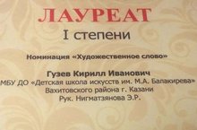 Учащийся театрального отделения Гузев Кирилл (рук. Нигматзянова Э.Р.) стал Лауреатом I степени в IV Международном фестивале театрального творчества им. Ш. Биктимирова « Әлмәндәр варислары» («Наследники Альмандара»). Фестиваль проходил 16 февраля в Казанском государственном институте культуры при содействии Фонда поддержки развития культуры при Президенте Республики Татарстан, а также Министерства культуры Республики Татарстан.