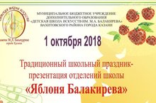 В Казанской Балакревке 1 октября 2018 года прошел традиционный школьный праздник-презентация отделений школы для первокласников и их родителей "Яблоня Балакирева". Первоклашки с удовольствием учавствовали в квесте "Путешествие по Казанской Балакиревке", где были представлены музыкальное, театральное, хореографическое и отделение изобразитольного искусства и декоративно прикладного творчества. На концерте к Международному дню Музыки ярко заявило о себе музыкальное отделение: выступления ансамбля скрипачей, фольклорного ансамбля народной песни, гитаристов, пианистов, баянистов встречали бурные овации учащихся!