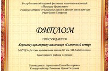 24 апреля состоялся Республиканский хоровой фестиваль мальчиков и юношей "Поющее братство" учащихся детских музыкальных школ и детских школ искусств РТ. В фестивале принял участие ансамбль мальчиков "Солнечный ветер" (преподаватель Арсентьева Е.В., концертмейстер Романова И.П.)
