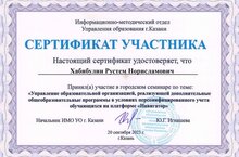 В семинаре приняли участие и получили соответствующие сертификаты директор нашей школы, Сафина А.Г. и исполняющий обязанности заместителя директора по УВР, заведующий организационно-массовым отделом, Хабибулин Р.Н.