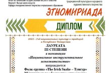 По результатам конкурса, фолк-группа «Irish Snake – Тунгур» ДМШ №7 им.З.В.Хабибуллина (художественный руководитель – Хабибулин Р.Н., преподаватели – Закиров А.А., Галимуллин Р.И., учащийся – Бацунов Григорий) – Лауреат III степени.