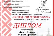 По результатам конкурса, в номинации «Дистанционная олимпиада «М.Д.Михайлов – настоящий русский бас. 3 возрастная категория», учащийся нашей школы, Бацунов Григорий (преподаватель – Столярова Н.А.) – Лауреат II степени.