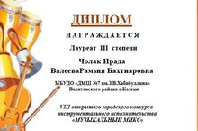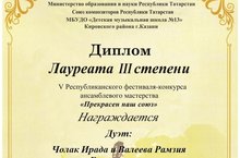 - в номинации «Учитель – ученик», дуэт: Чолак Ирада – Валеева Рамзия Бахтиаровна – Лауреат III степени;