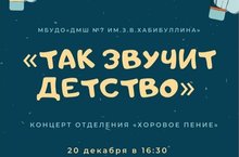20 декабря 2022 года в ДМШ №7 им.З.В.Хабибуллина состоялся хоровой концерт «Так звучит детство», в котором приняли участие: младший хор «Капитошки», средний хор «Большая перемена», старший вокальный ансамбль «Идель», а также юные вокалисты – Кашапова Асиля, Сиразиев Иван, Каюкова Татьяна, Кашапова Аделя и Фаттахова Марьям.