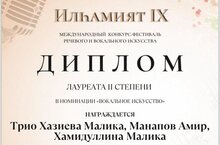 - трио: Манапов Амир, Хазиева Малика, Хамидуллина Малика – Лауреат II степени;