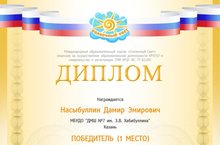 25 января 2021 года на Международном образовательном портале «Солнечный свет» (г.Москва) в онлайн-формате состоялся Международный конкурс «Вокальное и инструментальное творчество», по итогам которого учащийся нашей школы, Насыбуллин Дамир (преподаватель – Романова И.П.) награждён Дипломом победителя (I место) за работу «Людвиг ван Бетховен. «Багатель». Оп.119, №3».