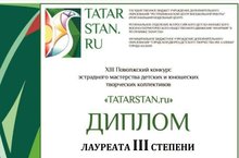 - в номинации «Эстрадный вокал на татарском языке – Соло. Возрастная категория: 9 – 11 лет», Фатхуллина Диляра (преподаватель – Сайфуллина А.Ф.) – Лауреат III степени;