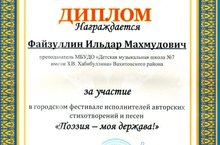 В ноябре 2020 года в Доме работников образования состоялся Городской фестиваль исполнителей авторских стихотворений и песен «Поэзия – моя держава» среди педагогов образовательных учреждений города Казани. Преподаватель нашей школы, Файзуллин Ильдар Махмудович принял участие в мероприятии и был награждён Дипломом фестиваля.