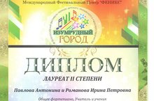 11 мая 2019 года в МБУДО «Детская музыкальная школа г.Зеленодольск Республики Татарстан» состоялся III Всероссийский фестиваль-конкурс детского, юношеского и взрослого творчества «Изумрудный город».По итогам фестиваля-конкурса, учащаяся нашей школы, Павлова Антонина и её преподаватель, Романова Ирина Петровна в номинации «Общее фортепиано. Учитель и ученик» – Лауреаты II степени.ПОЗДРАВЛЯЕМ!!!