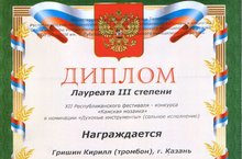 Поздравляем учащегося Гришина Кирилла , с получением диплома Лауреата III степени, в номинации "Духовые инструменты" (тромбон, сольное исполнительство), класс преподавателя-Шадров Н.А., концертмейстер-Булычева А.С.!