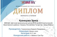 Поздравляем Кузнецову Эрику и её преподавателя по вокалу Гизатуллину Камилю Лемаровну со званием Лауреата 3 степени Международного фестиваля-конкурса " Звёздный путь"!