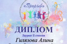 Поздравляем Гилязову Алину и ее преподавателя Валиеву Ригину Рифинатовну с победами в VI Респкбликанском фестивале-конкурсе " Прорыв"!