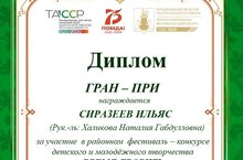 Поздравляем ученика 5 класса Сиразеева Ильяса и его преподавателя Халикову Наталию Габдулловну с присуждением ГРАН-ПРИ районного фестиваля- конкурса детского и молодёжного творчества " Время творить", посвящённого сразу трём датам: 75-летию Победы, 100-летию ТАССР и 90-летию Пестречинского района.