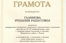 Наш воспитатель, Галимова Рушания Рашатовна, была награждена почетной грамотой Министерства Образования и Науки РТ, за весомый вклад в воспитание и обучение детей дошкольного возраста и многолетний добросовестный труд. Поздравляем!