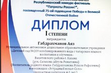 Воспитанник нашего детского сада Габдрахманов Аяз - дипломант Iстепени Республиканского конкурс-фестиваля "Патриоты России!",посвященный 75-ой годовщине Победы в Великой Отечественной Войне.