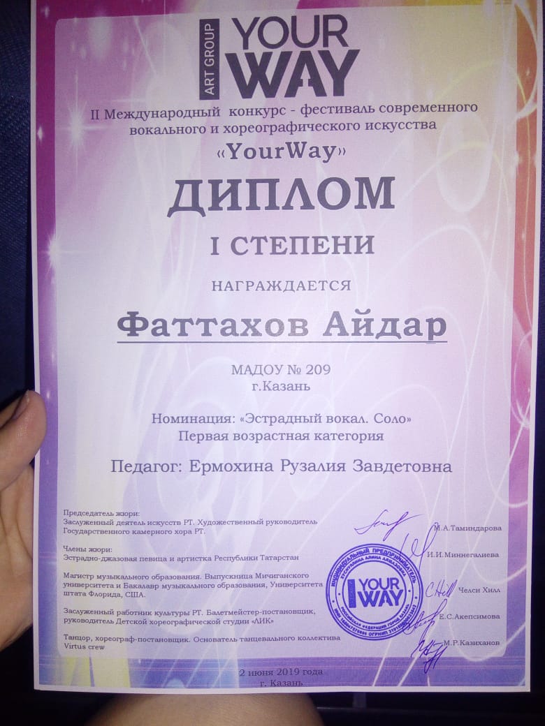 Воспитанник нашего детского сада Фаттахов Айдар - дипломант I степени II Международного конкурса-фестиваля современного вокального и хореографического искусства "YourWay" в номинации "Эстрадный вокал. Соло". диплом.jpg