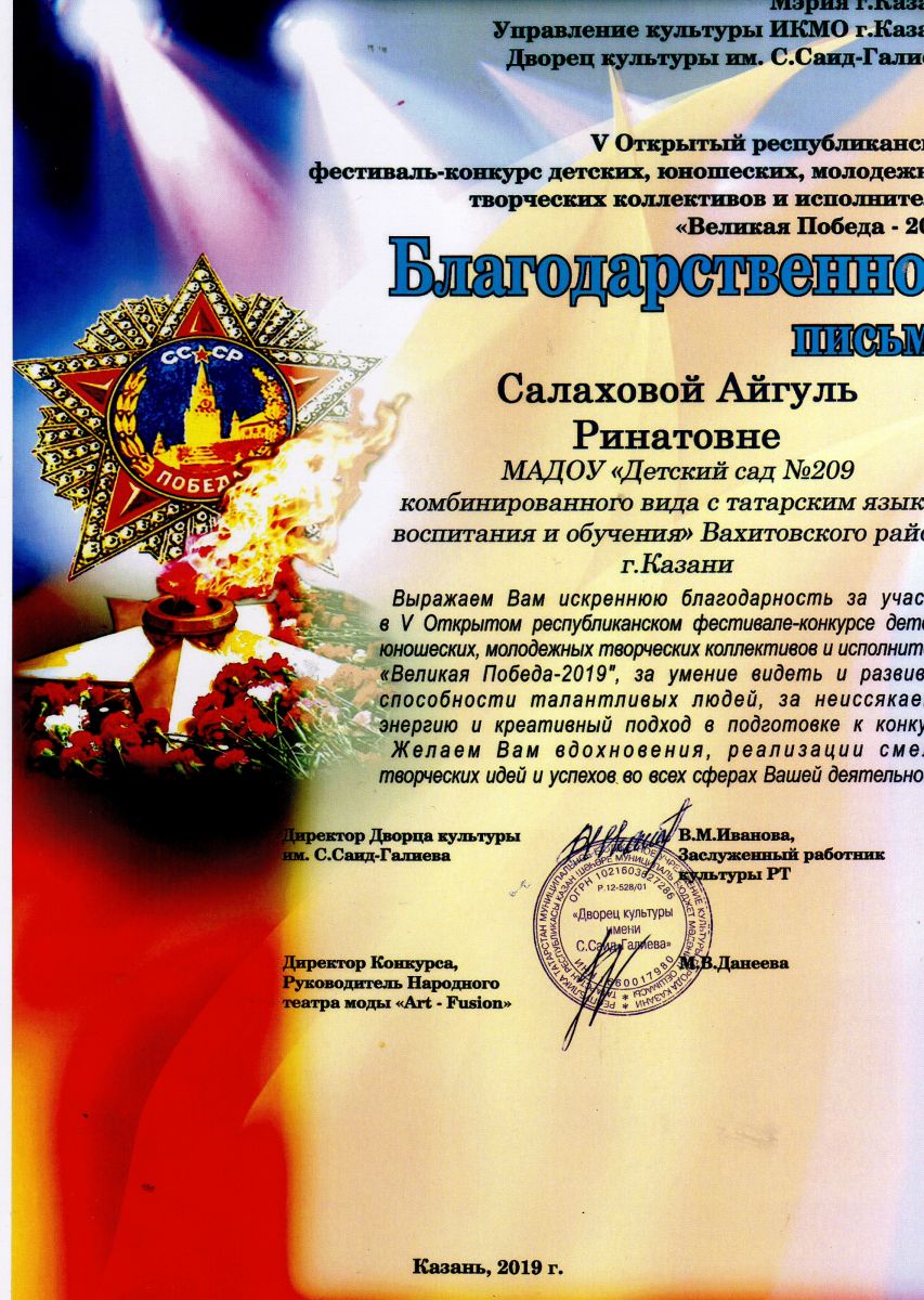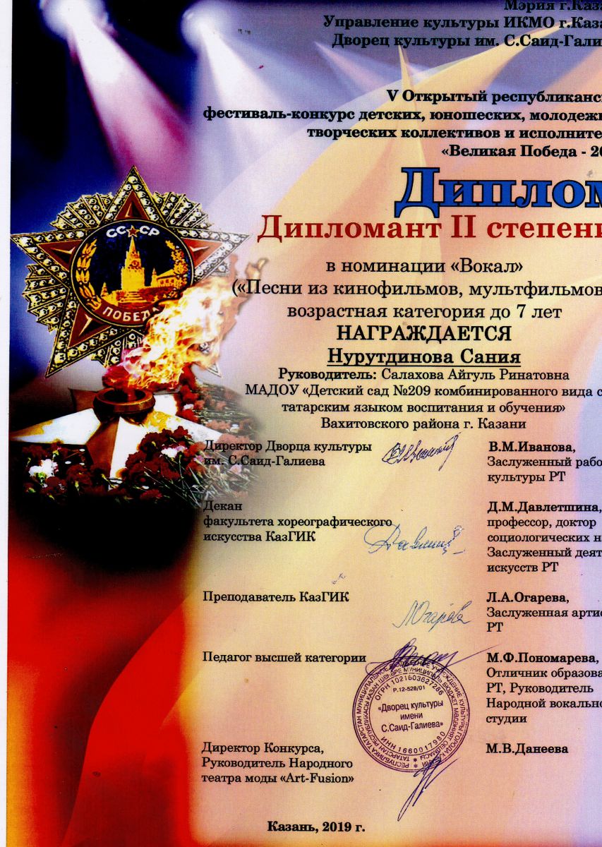 Воспитанница нашего детского сада Нурутдинова Сания - дипломант II степени V Открытого республиканского фестиваля-конкурса детских, юношеских, молодежных творческих коллективов и исполнителей "Великая Победа - 2019"