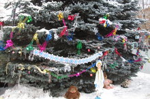 Детский сад уже встречает Новый год. Нарядили ёлку при входе, возле которой родители фотографируют своих детей.