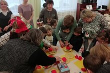 Дети посмотрели сказку, потанцевали с веселыми клоунами, а затем на мастер-классе, вместе с детьми из детского сада № 212 сделали своими руками из бумаги волшебные яблочки.