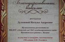 Музыкальный руководитель МБДОУ «Детский сад № 63»Наталья Андреевна получила Благодарственное письмо за участие в концерте, посвященному 190-летию Л.Н. Толстого