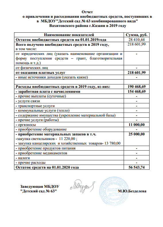 Отчет о привлечении и расходовании внебюджетных средств, поступивших в МБДОУ "Детский сад № 63" в 2019 год