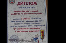 В городском семейном конкурсе среди воспитанников дошкольных образовательных учреждений и их родителей "От примерного пешехода- к вежливому родителю" Работа Махаева Богдана и его мамы заняла 3 место!!!