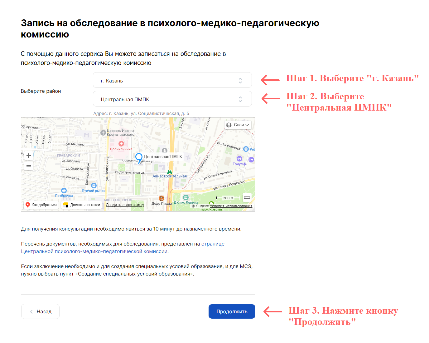 Интерфейс записи на портале интуитивно понятен. Но, если у Вас возникают сомнения, как записаться именно в ЦПМПК воспользуйтесь краткой инструкцией по первым шагам записи в электронную очередь: Инструкция по записи на ЦПМПК через портал госуслуг Республики Татарстан
