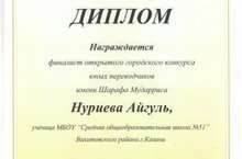 Ученица 9 класса Нуриева Айгуль стала финалисткой Открытого конкурса юных переводчиков имени Ш.Мударриса КФУ, где необходимо перевести с татарского на английский язык. На втором туре конкурса она представила перевод отрывка из произведения Ф.Шафигуллина «Акбай белән Карабай». Поздравляем Айгуль и ее педагогов Вавилову Г.А., Сарварову Л.Л.!